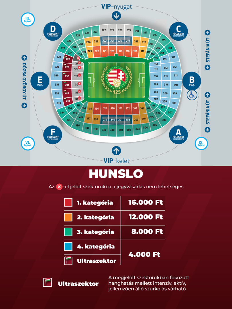 A jegyek és a bérletek a meccsjegy.mlsz.hu oldalon, illetve a Szurkolói Klub iOS-en és Androidon elérhető alkalmazáson keresztül vásárolhatóak meg.